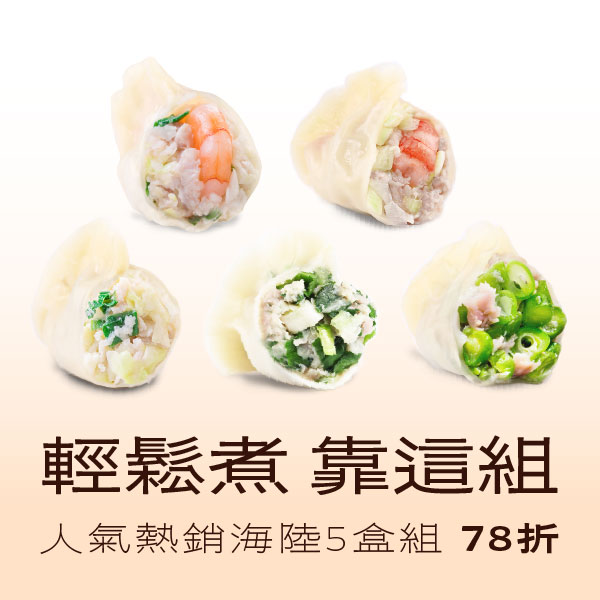【果貿吳媽家】▲好評熱銷組▲官網獨賣-海陸鮮蝦5盒組(高麗菜鮮蝦2、韭菜鮮蝦1、高麗菜鮮肉1、韭菜鮮肉1)◍熱銷5盒120顆,78折免運優惠◍搭配館內活動,加購享免運!