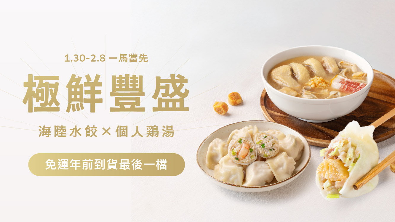 【極鮮豐盛組】一馬當鮮❗海陸金元寶X暖心湯品🥣年前超值優惠😍一組只要$1690📢全館滿額加碼送年菜✨(員外雞湯單入組、頂級干貝、高麗菜鮮蝦、高麗菜鮮肉2)