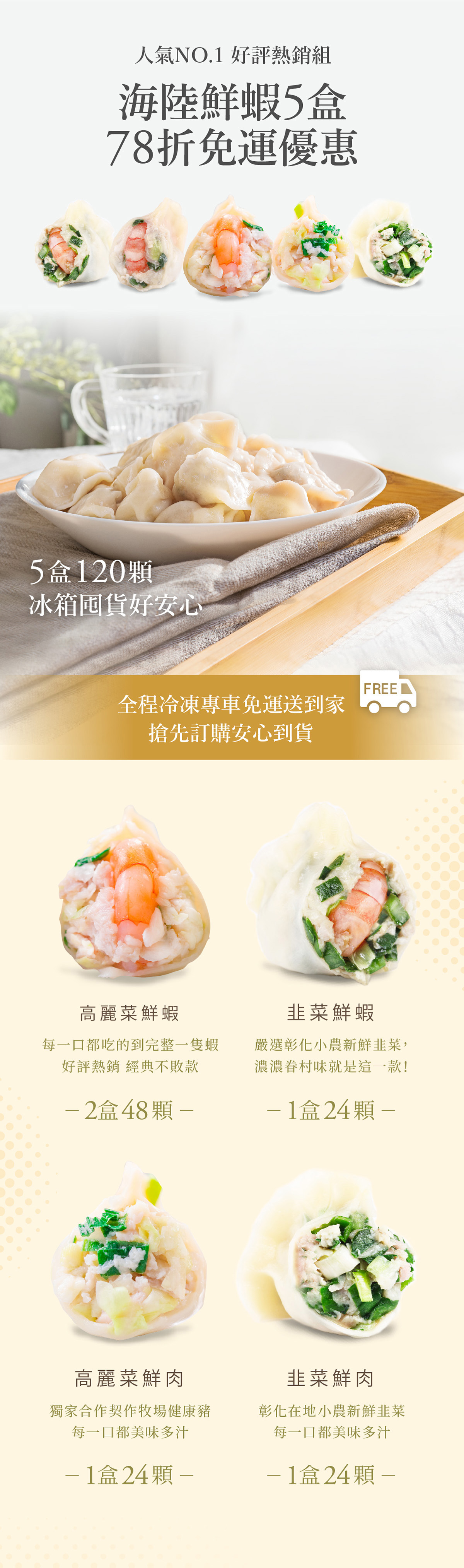 【果貿吳媽家】▲好評熱銷組▲官網獨賣-海陸鮮蝦5盒組(高麗菜鮮蝦2、韭菜鮮蝦1、高麗菜鮮肉1、韭菜鮮肉1)◍熱銷5盒120顆,78折免運優惠◍搭配館內活動,加購享免運!