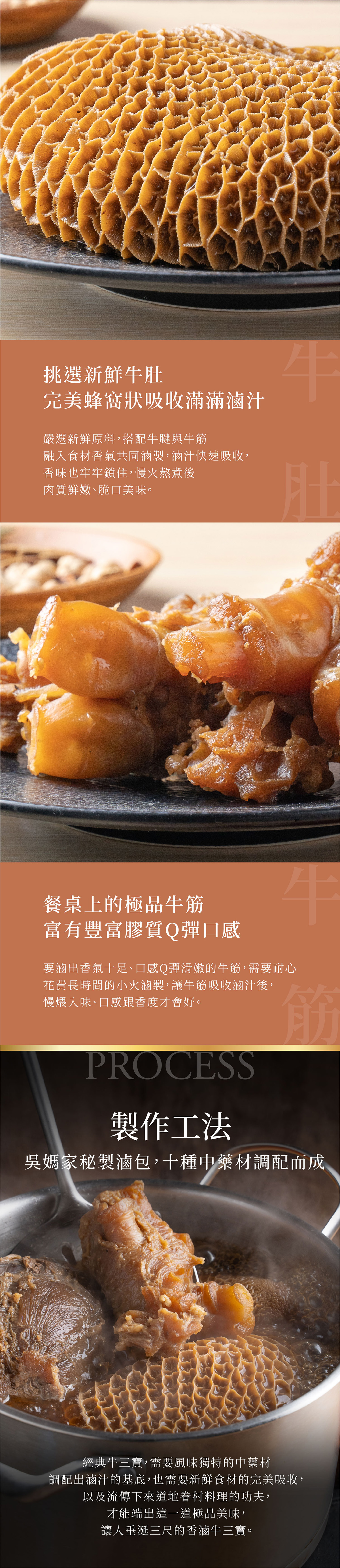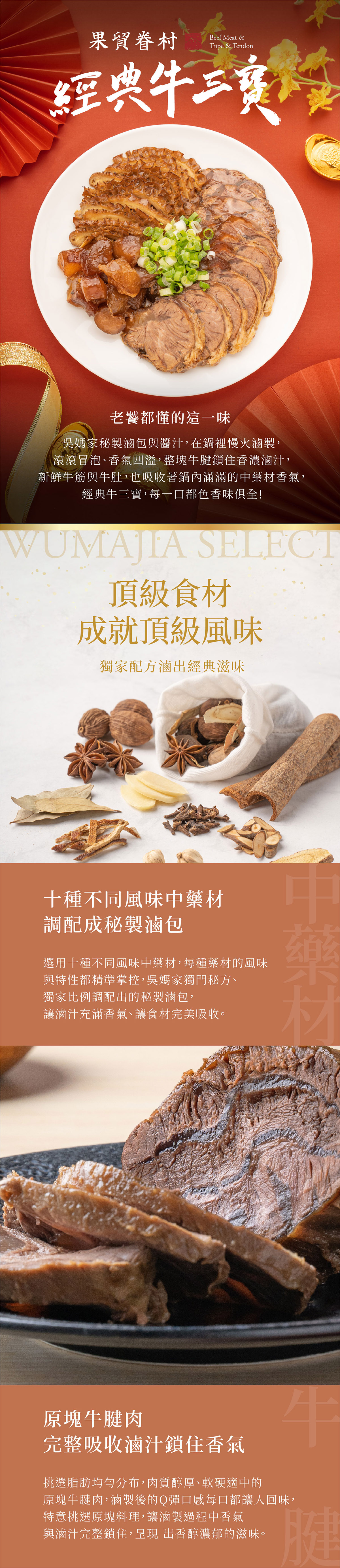 【果貿吳媽家】✨蘋果日報-年菜評比冠軍✨眷村經典牛三寶-1份950g◖老饕都懂這一味◗選用原塊牛腱,搭配香Q牛筋、新鮮牛肚完整吸收滷汁❗訂購請選到貨日,如指定日期請備註,整筆訂單統一出貨❗