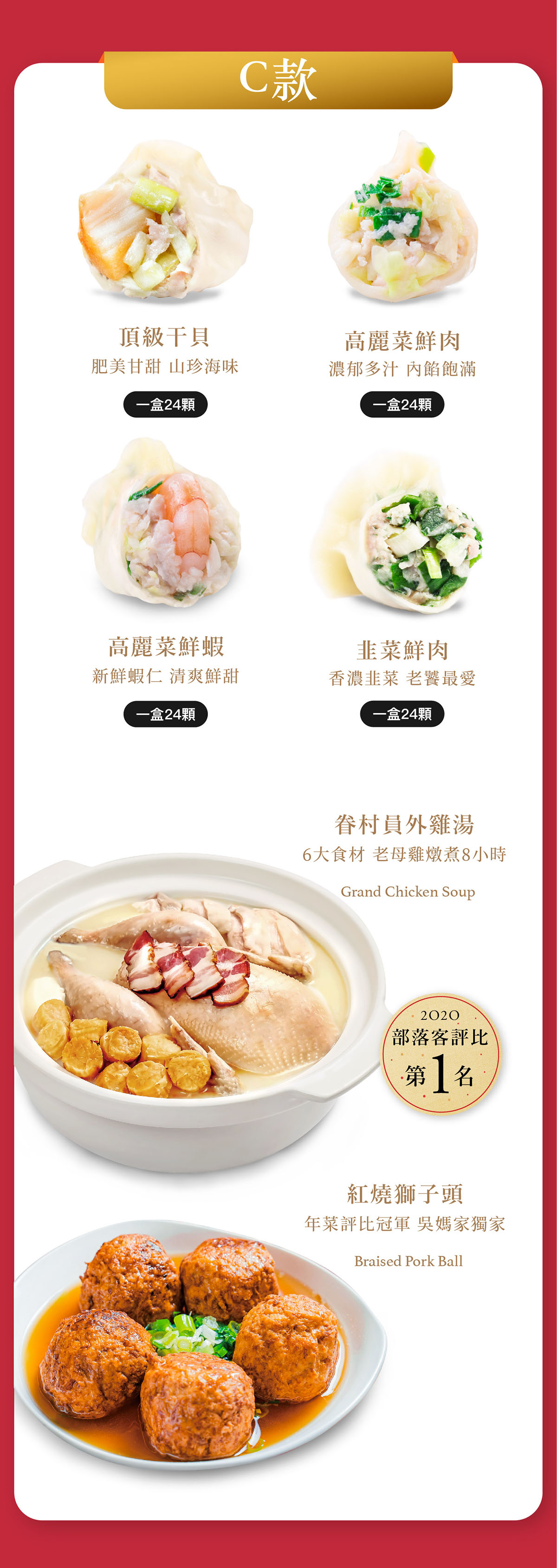 C款-員外雞湯1組、頂級干貝水餃1盒、高麗菜鮮蝦水餃1盒、高麗菜鮮肉水餃1盒、韭菜鮮肉水餃1盒、紅燒獅子頭1組