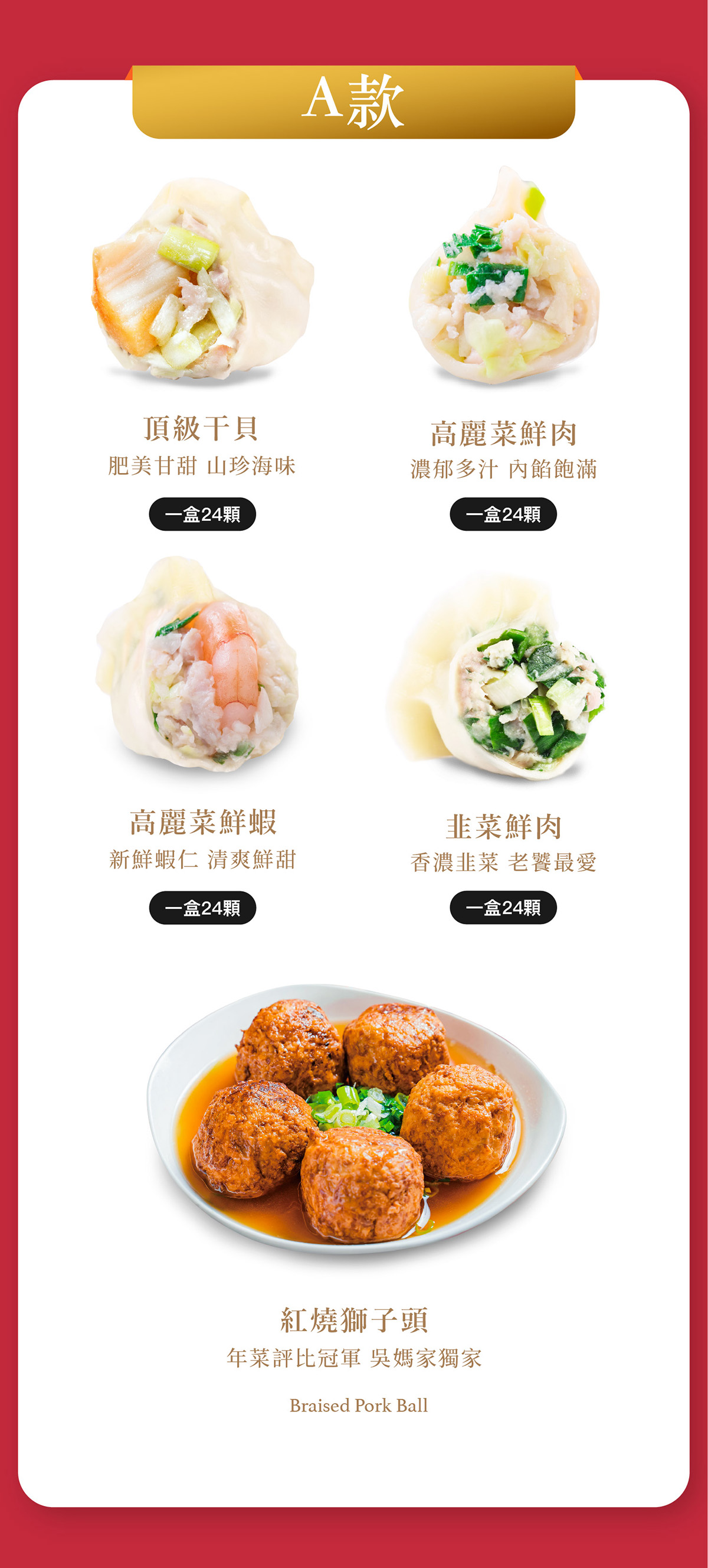 A款-頂級干貝水餃1盒、高麗菜鮮蝦水餃1盒、高麗菜鮮肉水餃1盒、韭菜鮮肉水餃1盒、紅燒獅子頭1組