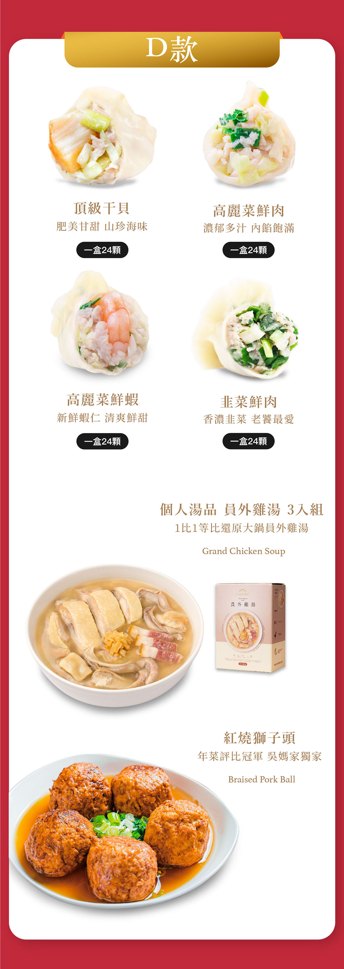D款-個人湯品員外雞湯3入組、頂級干貝水餃1盒、高麗菜鮮蝦水餃1盒、高麗菜鮮肉水餃1盒、韭菜鮮肉水餃1盒、紅燒獅子頭1組
