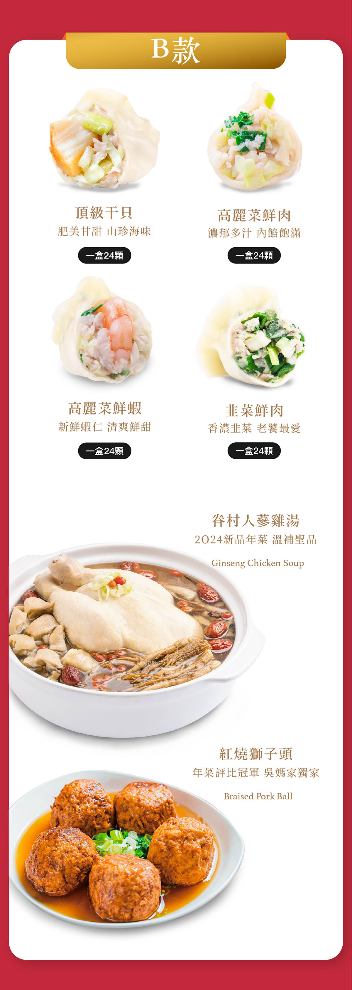 B款-人蔘雞湯1組、頂級干貝水餃1盒、高麗菜鮮蝦水餃1盒、高麗菜鮮肉水餃1盒、韭菜鮮肉水餃1盒、紅燒獅子頭1組
