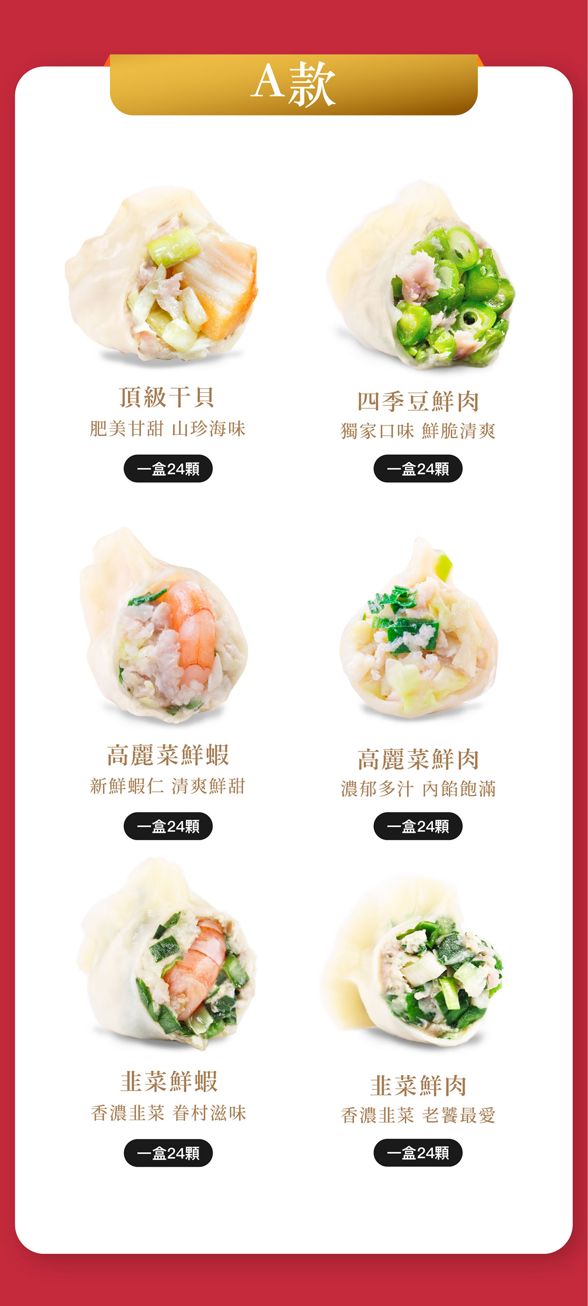 A款-頂級干貝水餃1盒、四季豆鮮肉水餃1盒、高麗菜鮮蝦水餃1盒、韭菜鮮蝦水餃1盒、高麗菜鮮肉水餃1盒、韭菜鮮肉水餃1盒