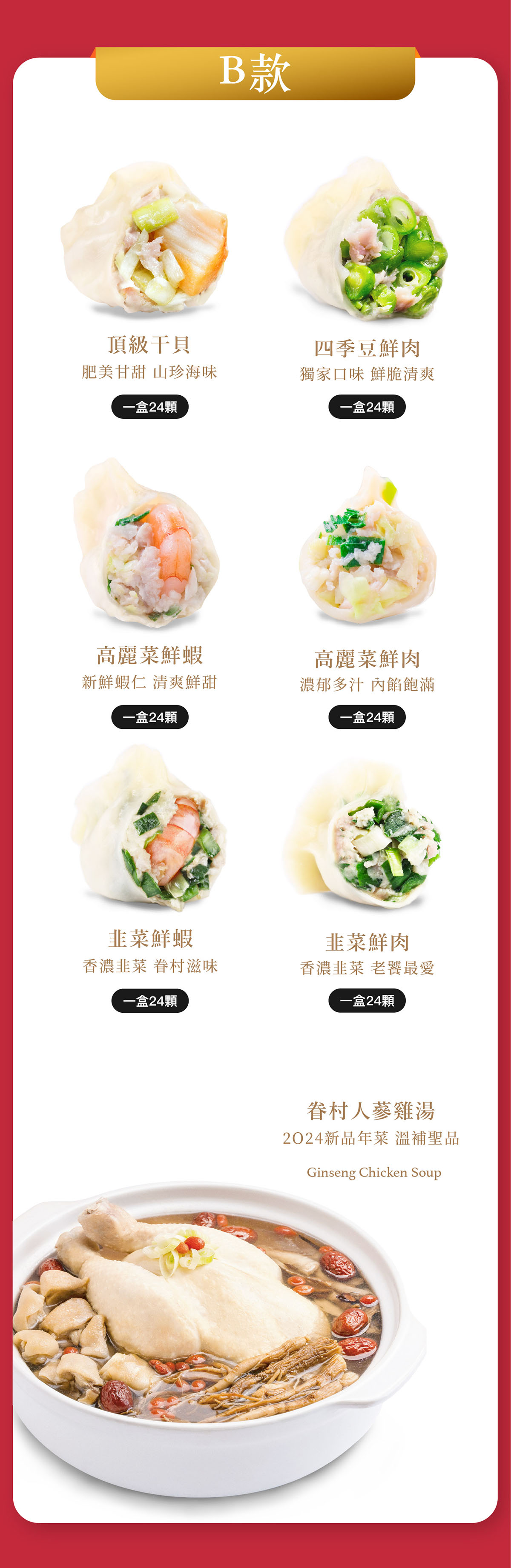 B款-人蔘雞湯1組、頂級干貝水餃1盒、四季豆鮮肉水餃1盒、高麗菜鮮蝦水餃1盒、韭菜鮮蝦水餃1盒、高麗菜鮮肉水餃1盒、韭菜鮮肉水餃1盒