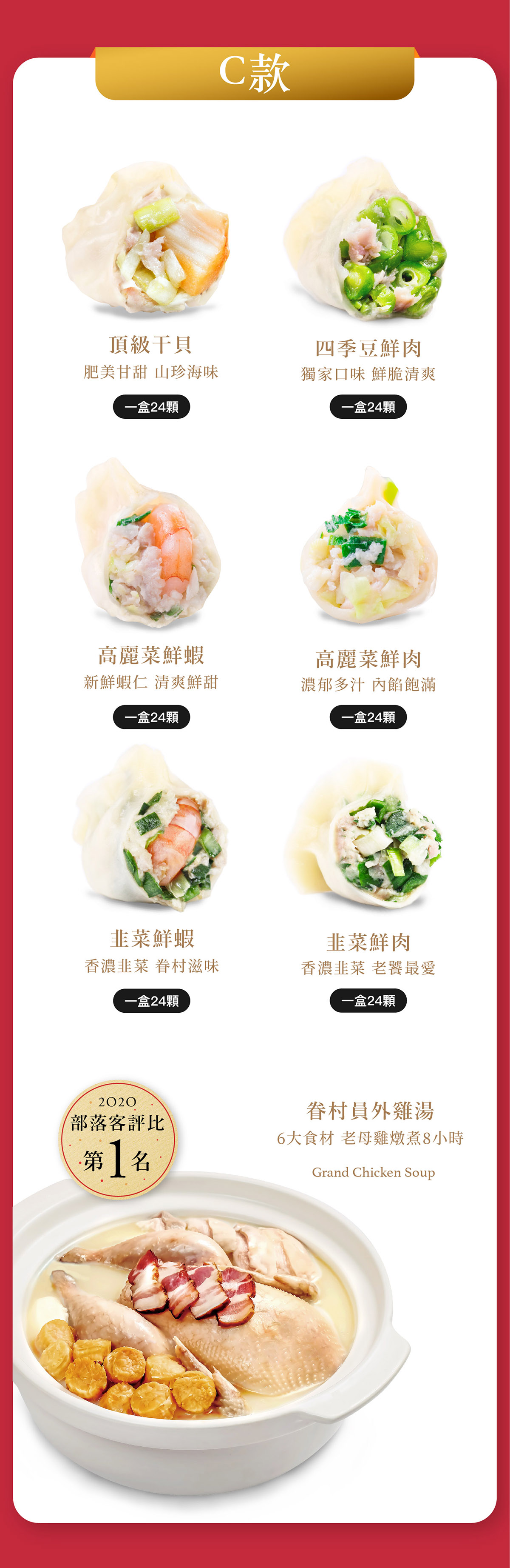 C款-員外雞湯1組、頂級干貝水餃1盒、四季豆鮮肉水餃1盒、高麗菜鮮蝦水餃1盒、韭菜鮮蝦水餃1盒、高麗菜鮮肉水餃1盒、韭菜鮮肉水餃1盒