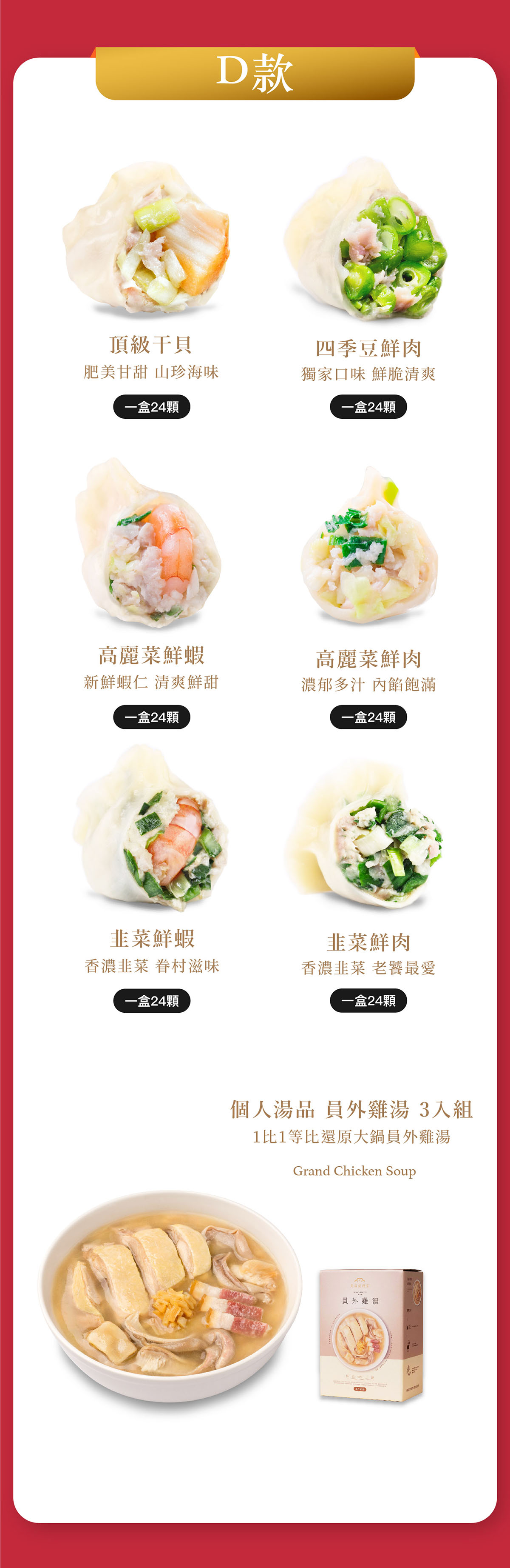 D款-個人湯品員外雞湯3入組、頂級干貝水餃1盒、四季豆鮮肉水餃1盒、高麗菜鮮蝦水餃1盒、韭菜鮮蝦水餃1盒、高麗菜鮮肉水餃1盒、韭菜鮮肉水餃1盒