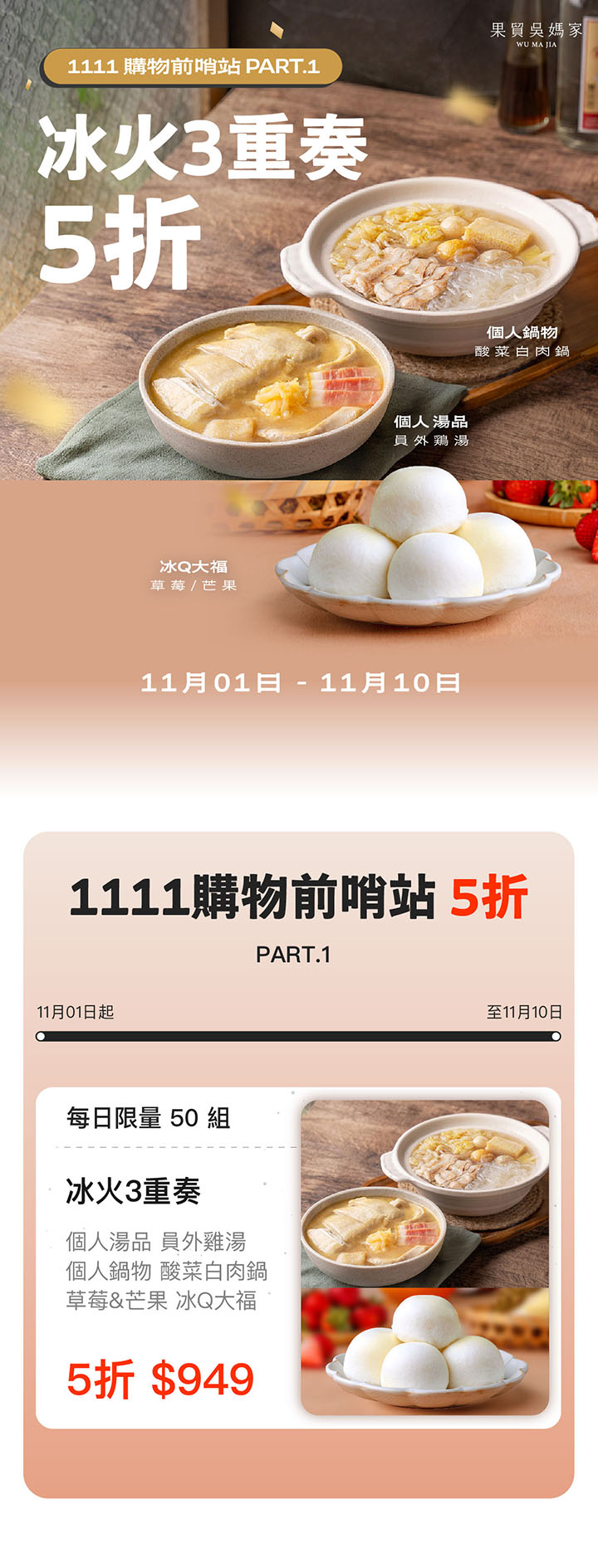 1111暖身購物前哨站◖PART 1◗冰火三重奏⭐嗨翻雙11⭐人氣湯品鍋物X冰Q大福~5折下殺必買優惠❗每單限購1組(個人員外雞湯單入組、個人酸菜鍋單入組、冰Q大福A款)