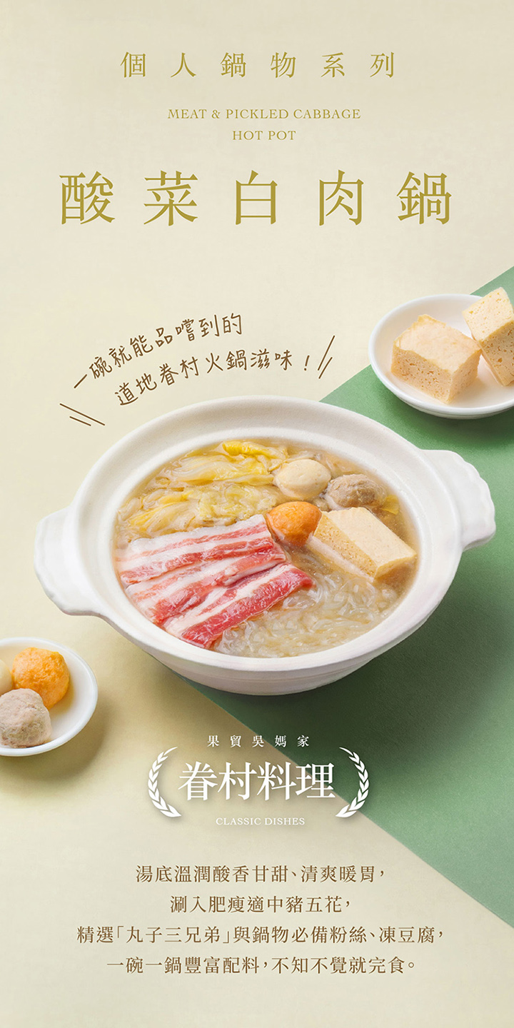 個人湯品員外雞湯單入1盒、個人鍋物酸菜白肉鍋單入1盒、冰Q大福A款1盒6顆