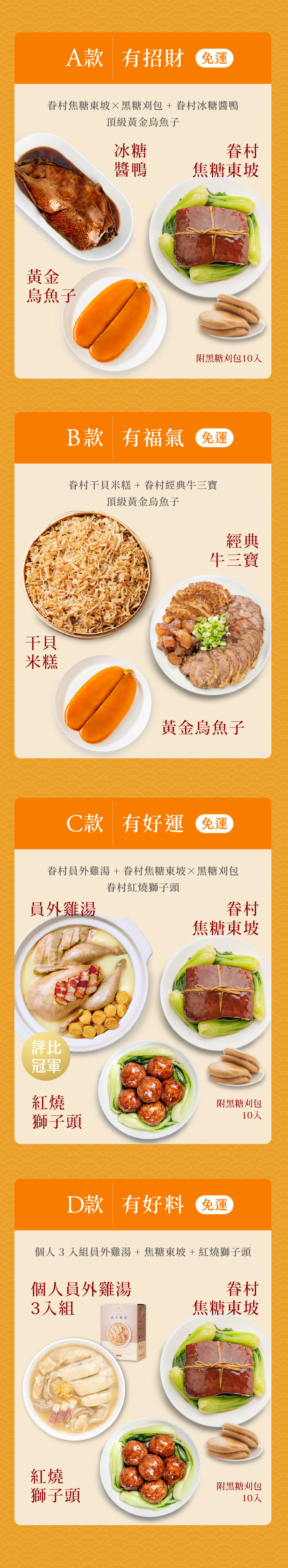 A款-有招財組(焦糖東坡X黑糖刈包1組、冰糖醬鴨1組、頂級黃金烏魚子1組)