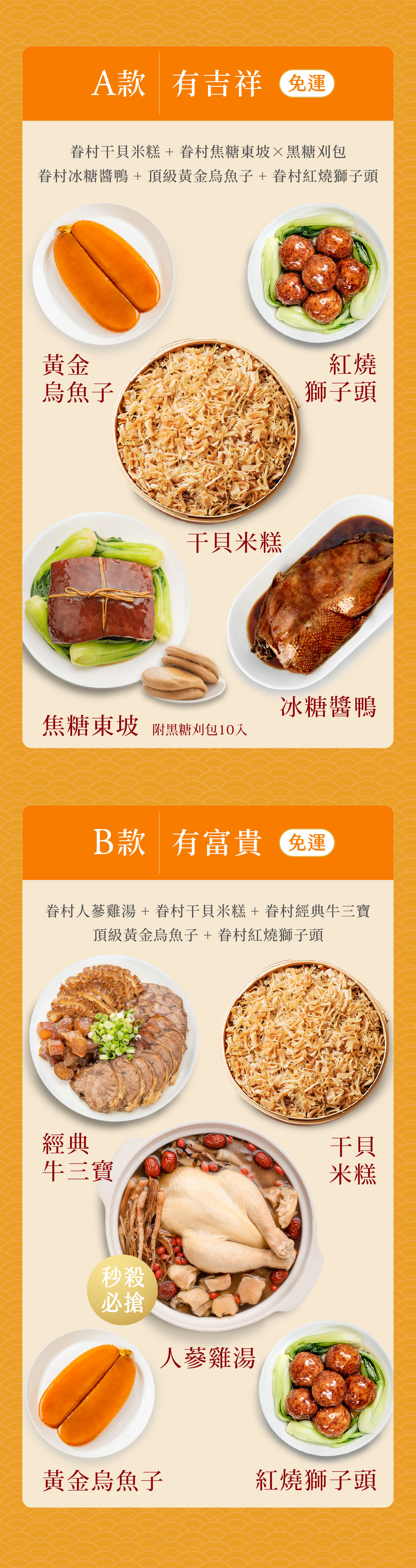 A款-有吉祥組(干貝米糕1組、焦糖東坡X黑糖刈包1組、冰糖醬鴨1組、頂級黃金烏魚子1組、紅燒獅子頭1組)