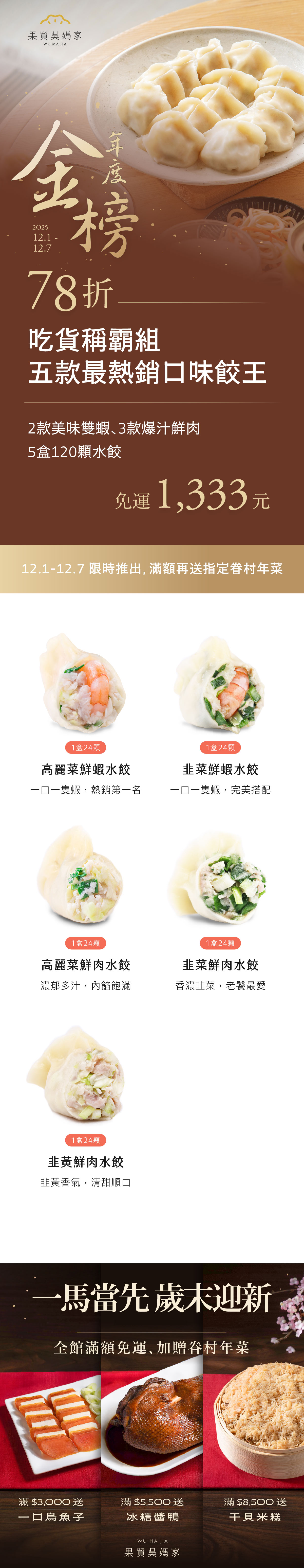 【吃貨稱霸組】年度美味金榜⭐最強餃王❗5款人氣海陸水餃,限時78折❗大份量120顆,期間限定$1333(高麗菜鮮蝦、韭菜鮮蝦、高麗菜鮮肉、韭菜鮮肉、韭黃鮮肉)