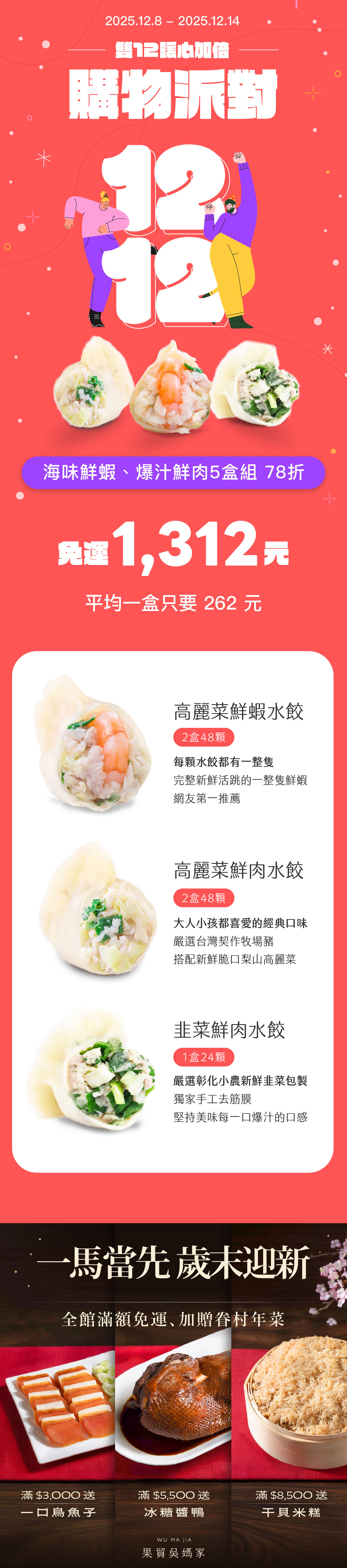 【雙12派對組】雙12獨家限定,暖心加倍✨美味水餃吃飽飽→吳媽家經典海陸口味,78折超值免運優惠中(高麗菜鮮蝦2、高麗菜鮮肉2、韭菜鮮肉1)