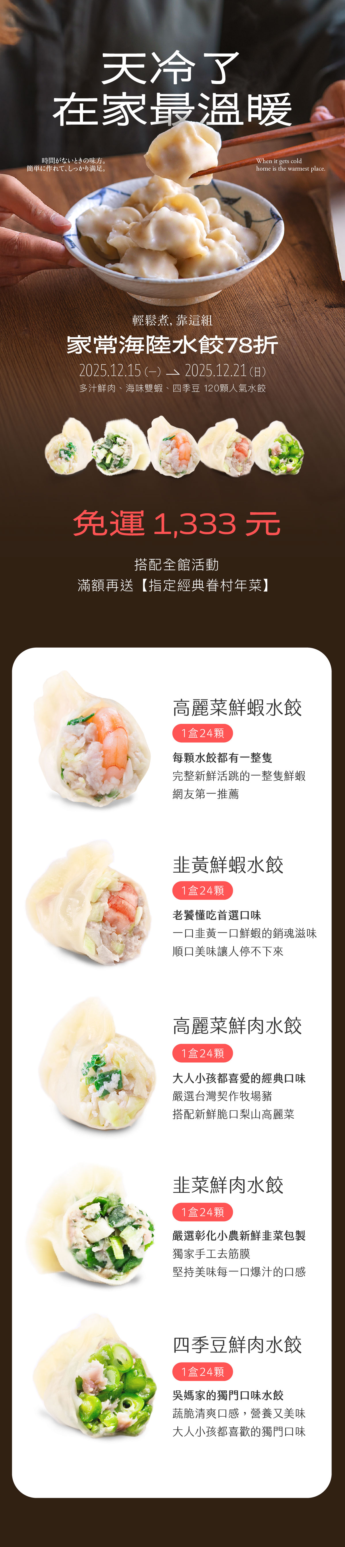 【家常海陸組】冬日料理簡單煮◍在家自煮的首選◍5款熱銷海陸水餃78折,超值免運優惠中❗(高麗菜鮮蝦、韭黃鮮蝦、高麗菜鮮肉、韭菜鮮肉、四季豆鮮肉)