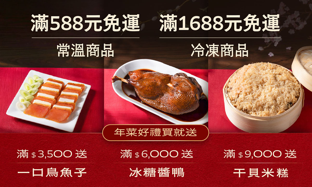 全館常溫品588免運、冷凍品1688免運,滿額贈年菜!