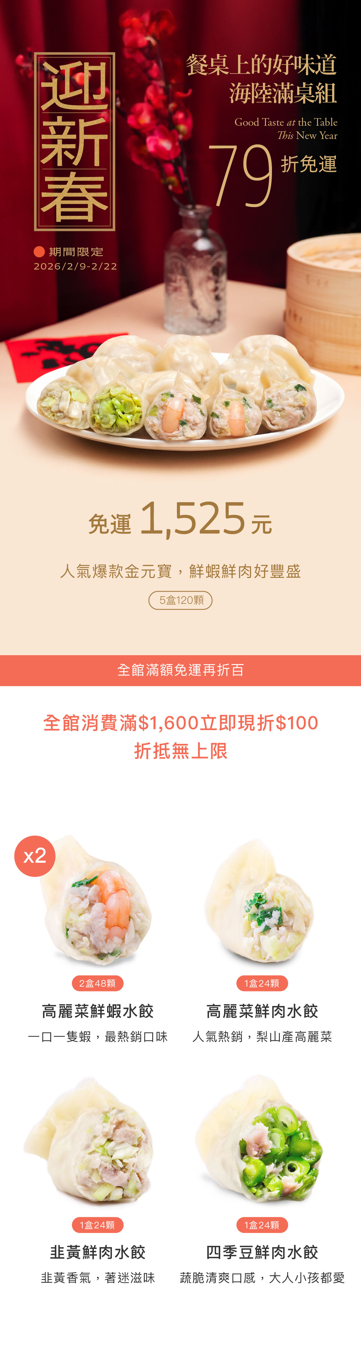 【海陸滿桌組】迎新春吃元寶🧨好運海陸口味🔥79折優惠🔥一組只要$1525免運😍全館滿額再折百(高麗菜鮮蝦2、高麗菜鮮肉、四季豆鮮肉、韭黃鮮肉)