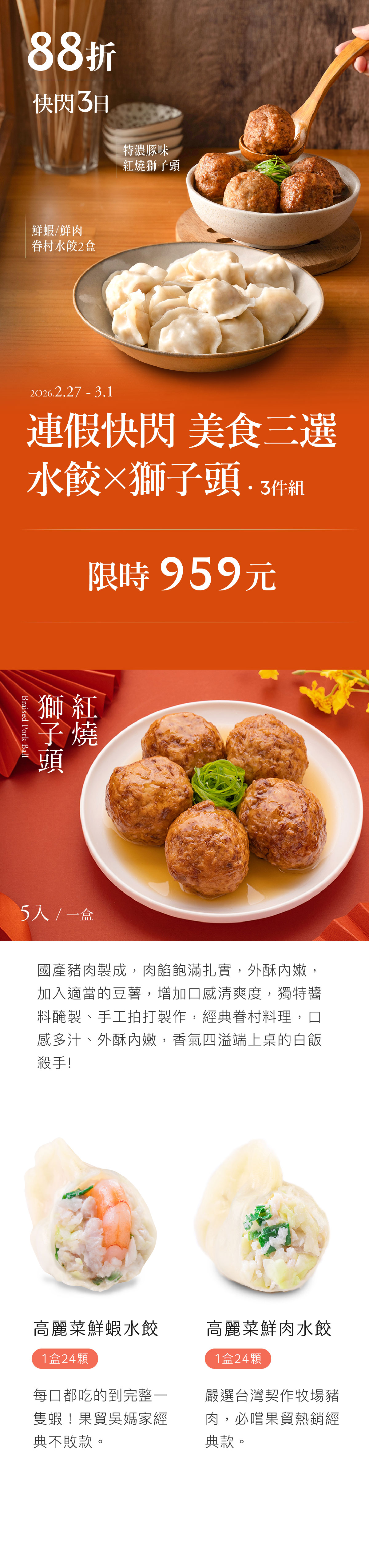 【連假必吃組🎉】美味三選88折🌟真材實料、手工現包的水餃,新鮮上桌🥟🧆假期優惠$959👉全館滿額就享冷凍免運,達指定門檻再折百🤩(高麗菜鮮蝦、高麗菜鮮肉、紅燒獅子頭)