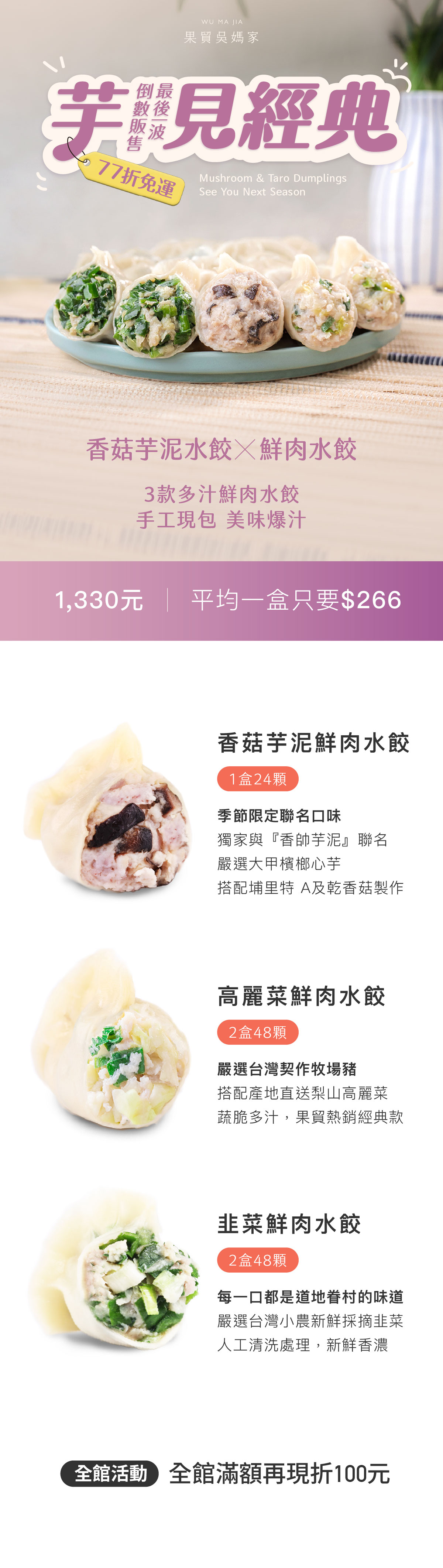 【芋見經典組】感恩香芋💜倒數販售❗吳媽家經典X濃郁系芋泥💜77折超值免運📢5盒120顆✨錯過再等明年✨(香菇芋泥鮮肉、高麗菜鮮肉、韭菜鮮肉)