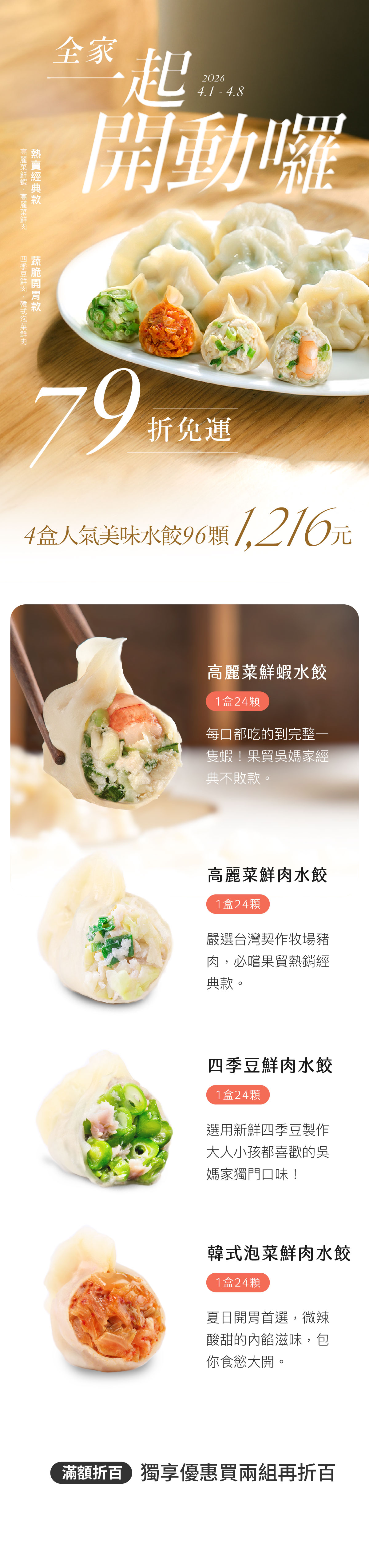 【全家開動組】好料總動員😋連假限定79折📢全家都愛吃的,人氣海陸水餃🙌一組只要$1216免運❗❗全館滿額再折百(高麗菜鮮蝦、高麗菜鮮肉、四季豆鮮肉、韓式泡菜鮮肉)