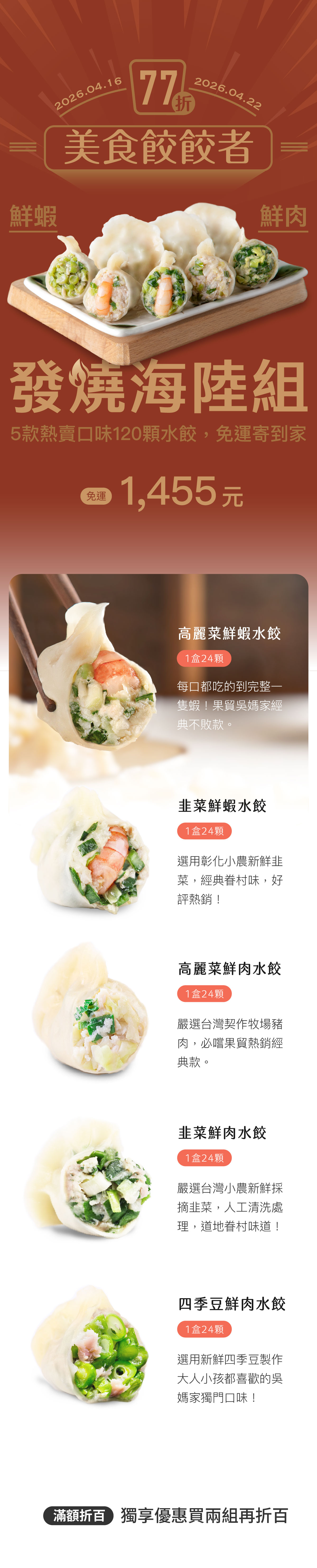 【海陸發燒組🔥】美味餃餃者🥟吳媽家熱銷單品🥇5款海陸水餃77折📢超值冷凍免運,滿額再折百💥(高麗菜鮮蝦、韭菜鮮蝦、高麗菜鮮肉、韭菜鮮肉、四季豆鮮肉)